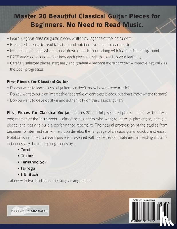 Learning classical guitar pieces from paper is one thing, but once you hear them, they become much easier to learn. First Pieces for Classical Guitar contains supporting audio for each track, to help you get inside the music and quickly improve your ability.